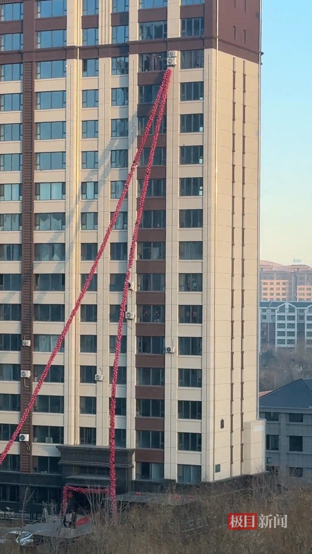 11月21日,内蒙古赤峰市一对新人结婚,两条50米长的气球飘带,从15楼的婚房一直垂到地面,壮观场景让小区居民大为惊叹。21日下午,新郎好友张先生告诉极目新闻记者,总共有4000个气球,30个好友吹了3天才吹完。