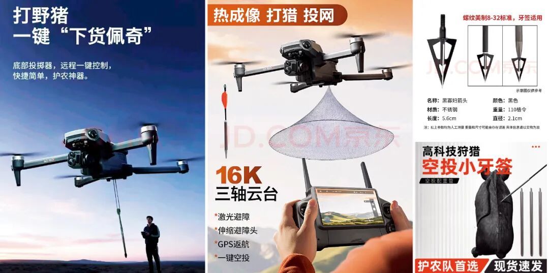 在电商平台搜索“无人机狩猎”“无人机空投箭头”后出现的一些带有夜视/热成像功能的无人机产品和配件,这些产品明确标注了打猎或空投用途。图/网络截图