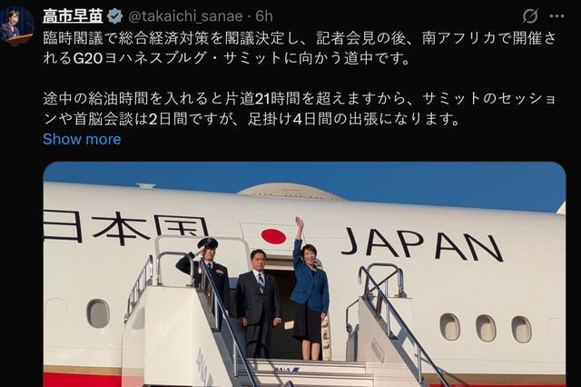 然而日本方面似乎并没有理解当中的含义。11月21日,沉寂了一段时间的高市早苗在社交媒体上发文,宣布自己已经登上前往南非的飞机。