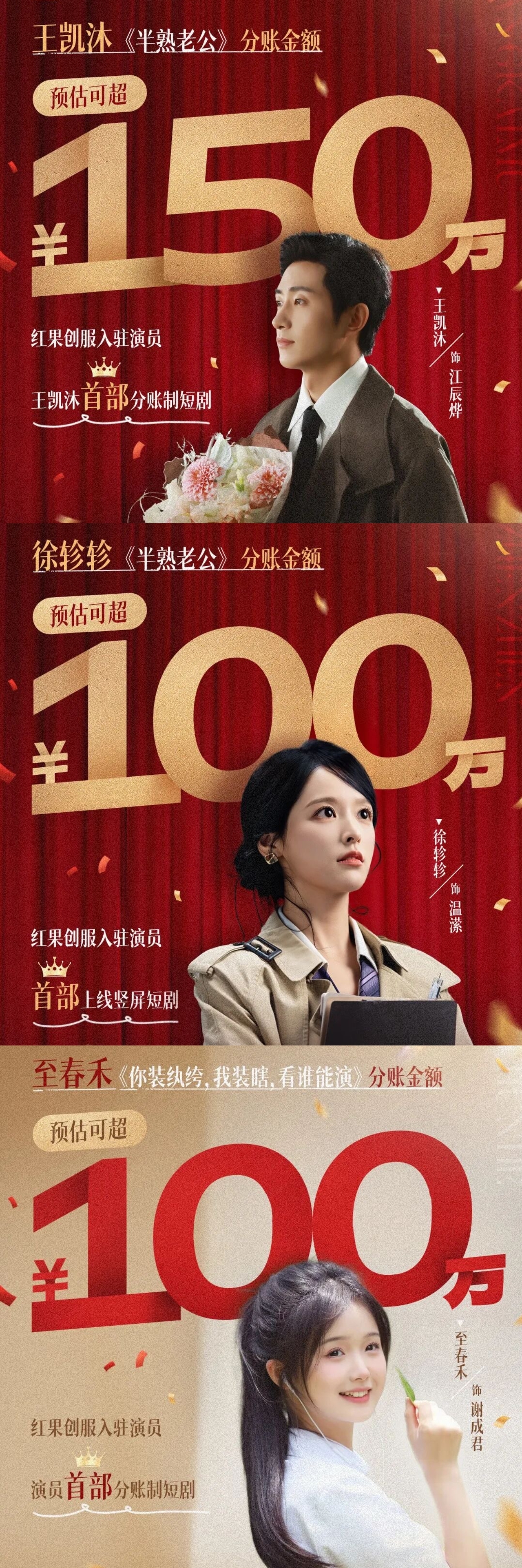引领短剧赢得史诗级逆转的旗手无疑是红果短剧平台。11月20日晚,红果首次对外公布演员分账数据,三位平台入驻演员喜提百万级分红。其中,王凯沐和徐轸轸在《半熟老公》项目中分账预估金额分别为150万和100万;至春禾在《你装纨绔,我装瞎,看谁能演》中预估分账也超过百万。