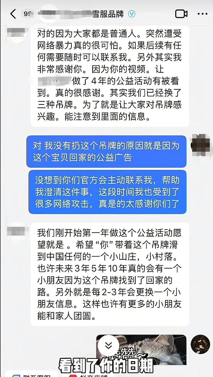 11月20日,邓女士发布被网友质疑“吊牌姐”的后续视频。邓女士称,滑雪服商家的官方品牌负责人孟女士联系她,希望帮她澄清吊牌事件。孟女士查询了订单,发现滑雪服于2023年购买,并不存在退款退货,因为该事件,滑雪服商家做了4年的公益活动被更多人看到。