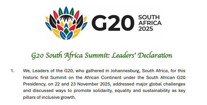 这是G20峰会首次于开幕当日通过联合宣言。峰会宣言共包含122条内容,强调通过多边合作应对全球挑战,并呼吁加强对发展中国家的支持,以推动包容性增长与可持续发展。这反映了当前国际社会的共识与诉求,将重塑未来的国际秩序。