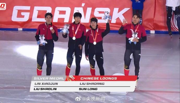 【中国短道队男子5000米接力银牌】短道速滑巡回赛格但斯克站男子5000米接力决赛,中国队林孝埈、刘少昂、孙龙、刘少林出战。比赛中荷兰队犯规导致中国队与意大利队发生碰撞,最终中国队获得银牌,韩国队获得金牌。(央视新闻)