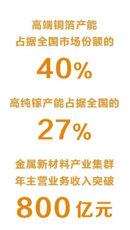 高端铜箔产能占据全国市场份额的40%,高纯镓产能占据全国的27%;金属新材料产业集群年主营业务收入突破800亿元,入选河南省首批战略性新兴产业集群;全社会研发投入强度从2021年的1.81%提升至2024年的2.99%,持续稳居全省“第一梯队”……