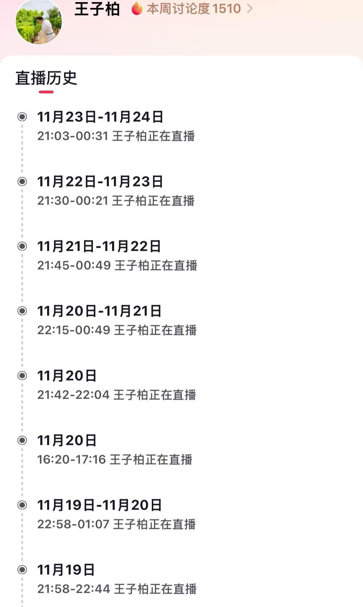 此外,记者发现,2025年9月6日,王子柏平台开启偷税事件后的首次直播。进入11月以来,王子柏直播频率明显上升,在11月8日至24日期间共计直播19场。令不少网友注意的是,复出后的他在造型上也出现显著变化:以往标志性的短发油头转变为中分发型,整体穿搭风格也趋于女性化。截至目前,“王子柏”账号在国内社交平台上已积累23万粉丝。