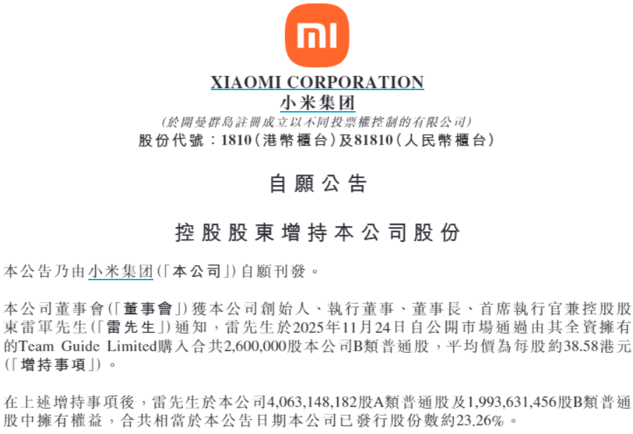 【大河财立方消息】 11月24日,小米集团发布公告称,公司董事会获创始人、执行董事、董事长、首席执行官兼控股股东雷军通知,其于11月24日自公开市场通过由其全资拥有的Team Guide Limited购入合共260万股公司B类普通股,平均价为每股约38.58港元,总计超1亿港元。