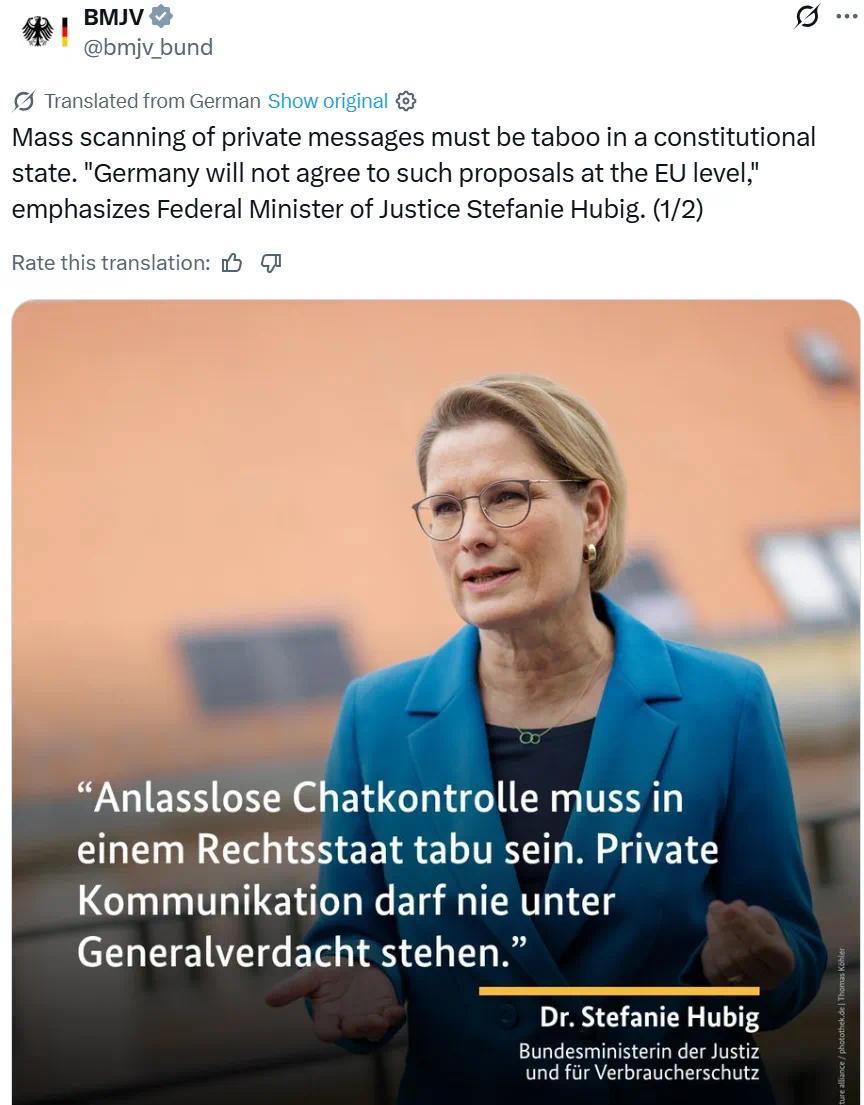 ▎10月8日,德国司法和消费者保护部在X平台上发表声明,部长胡比格表示反对欧盟进行大规模扫描私人信息。(图源:X平台截图)