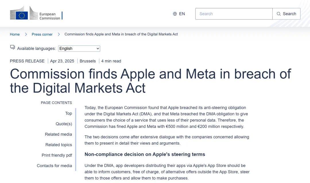 ▎2025年4月,欧盟委员会裁定苹果和Meta违反了《数字市场法案》(Digital Markets Act),该法案是欧盟为规范大型数字平台行为、促进公平竞争而制定的法律框架。(图源:欧盟委员会官网)