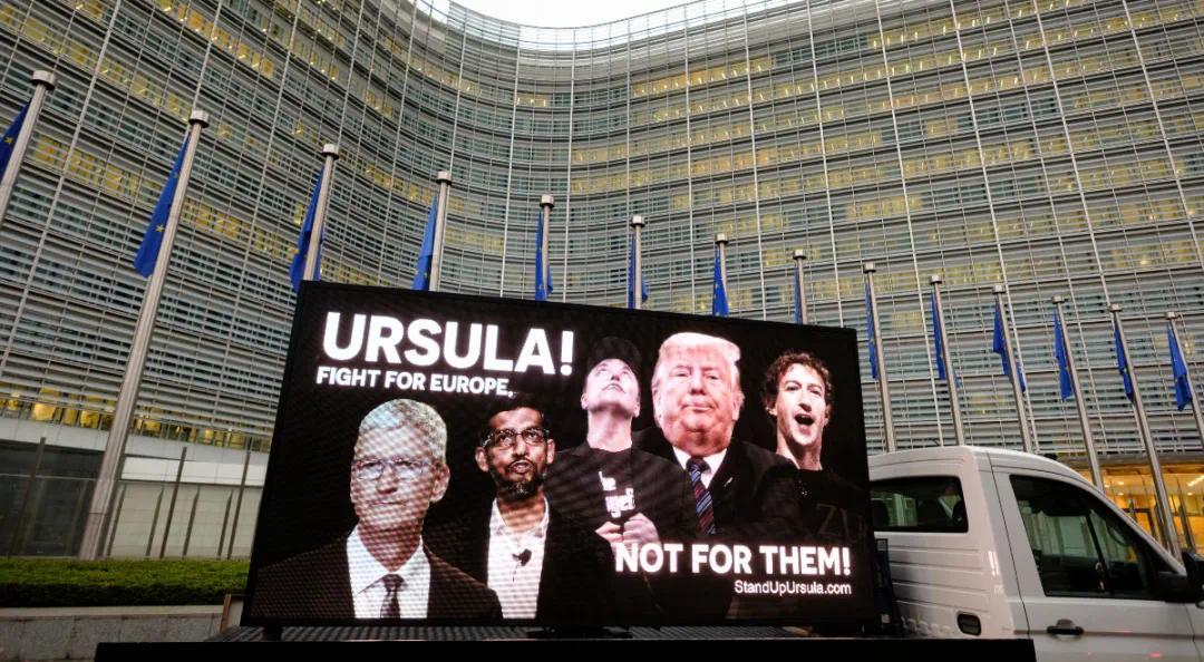 ▎11月19日,活动人士驾车在欧盟大楼前,呼吁欧盟委员会主席冯德莱恩挺身对抗美国总统特朗普和大型科技公司。(图源:盖蒂图片社)