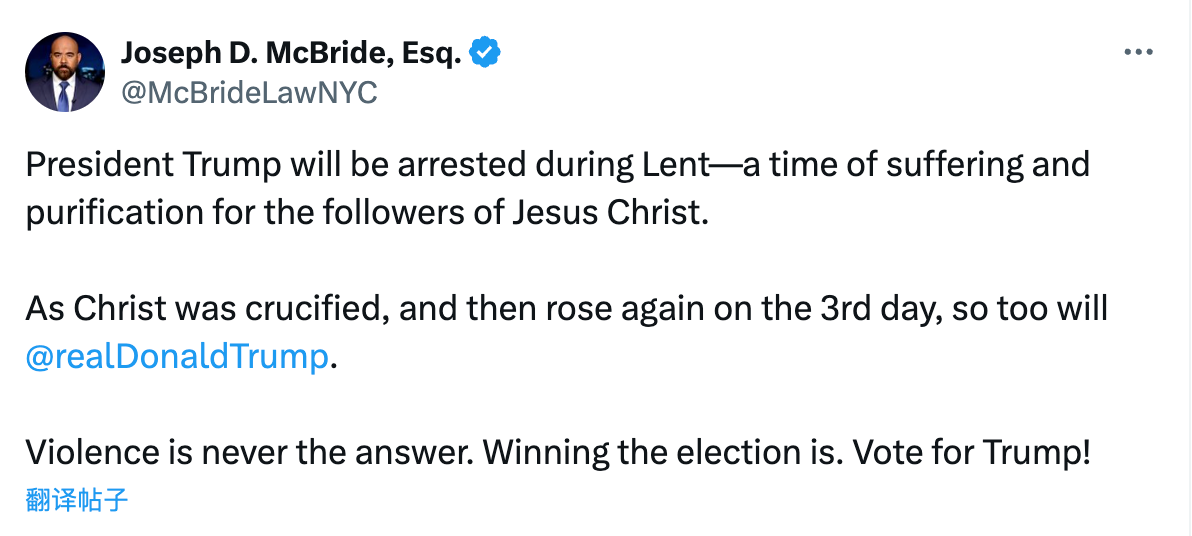 图为美国右翼律师于当地时间2023年3月18日在社交平台推特(X)的发言,将特朗普面临的司法调查类比为基督受难。图片来源:X