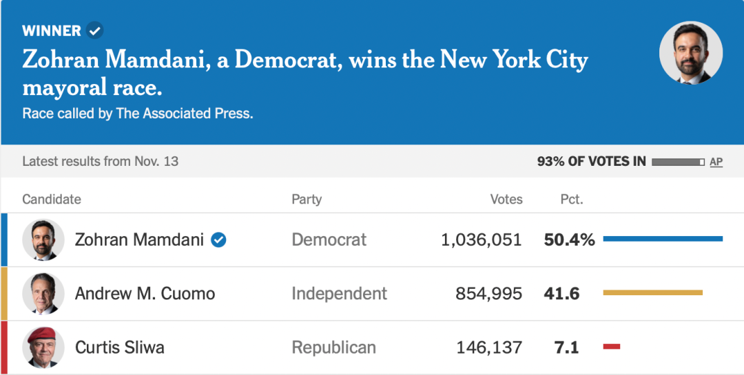 ▎纽约市长竞选计票结果显示,当选市长马姆达尼得票率为50.4%,独立候选人科莫得票率为41.6%,共和党候选人斯利瓦得票率为7.1%。图源:The New York Times