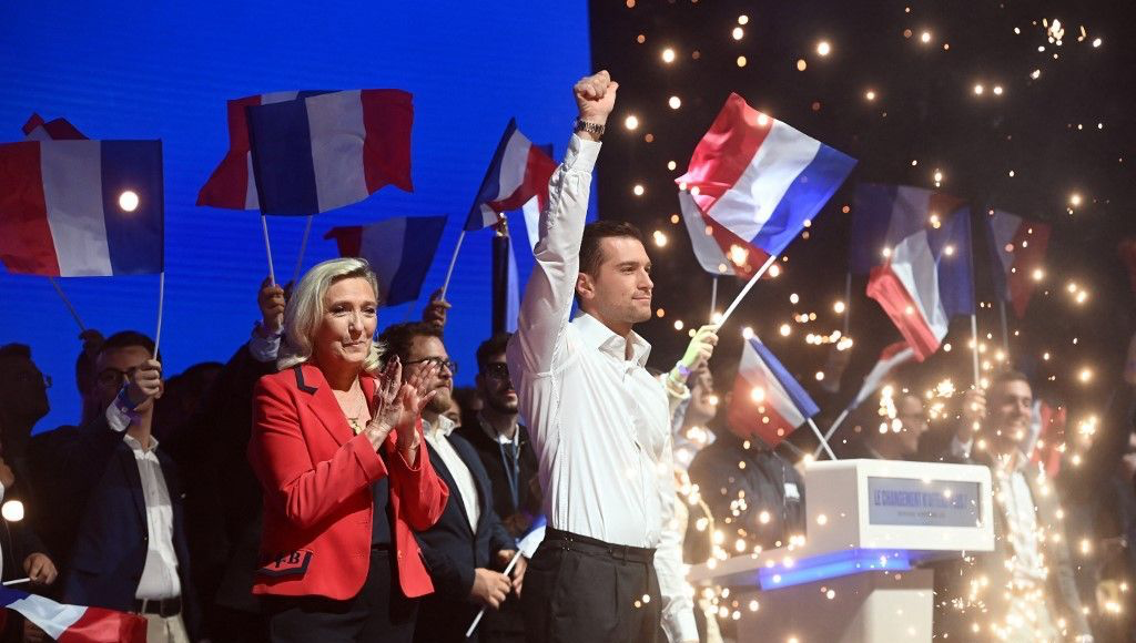 ▎法国极右翼政党国民联盟主席巴尔代拉(右)与前任主席勒庞(左)在国民联盟的集会上。由于勒庞被裁定挪用欧盟资金罪名成立,她将被禁止参加未来五年的选举。图源:AFP