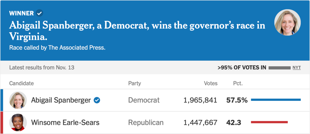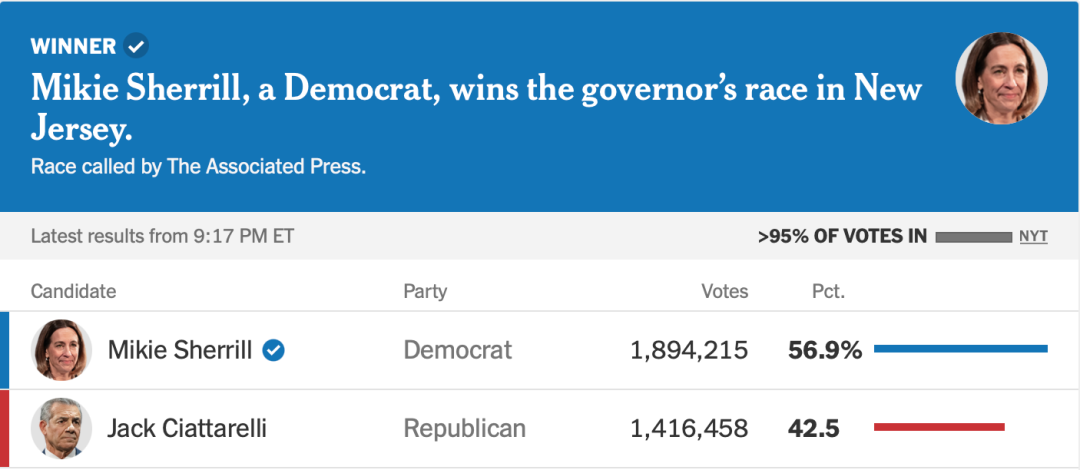 ▎弗吉尼亚州州长竞选计票结果显示,当选州长斯潘伯格得票率为57.4%,领先对手超过15个百分点。新泽西州州长竞选计票结果显示,当选州长谢里尔得票率为56.9%,领先对手也有超过14个百分点。图源:The New York Times