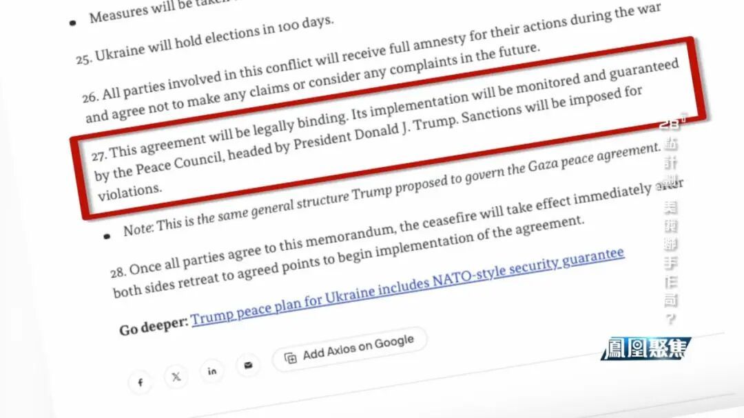 据凤凰卫视报道,关于俄乌停火,特朗普政府突然抛出了一份“28点计划”。这份由美国一手炮制的计划由于过于偏袒俄罗斯而引发了轩然大波,更被乌克兰国内称为投降计划。美国、乌克兰、欧盟和英法德三国的代表在瑞士紧急会谈,而距离特朗普为乌克兰开出的倒计时还有不到三天。这份计划正在如何发酵,又如何影响俄乌以及整个欧洲的局势?
