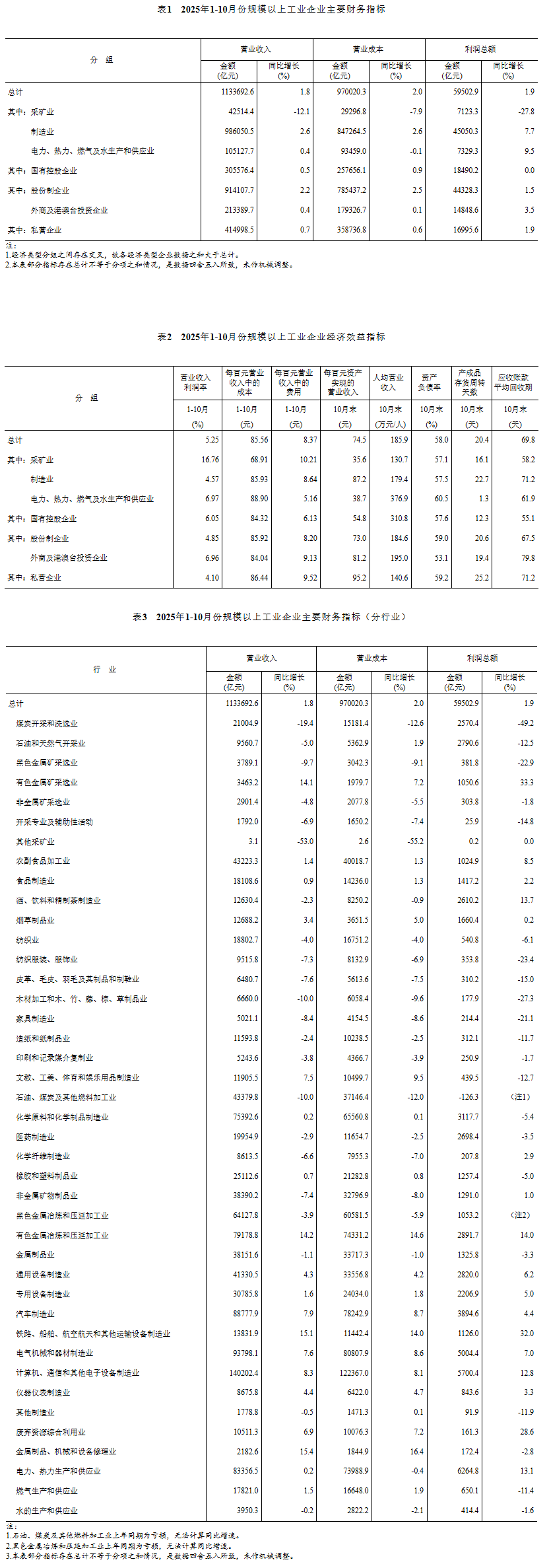 1—10月份,规模以上工业企业实现营业收入113.37万亿元,同比增长1.8%;发生营业成本97.00万亿元,增长2.0%;营业收入利润率为5.25%,同比提高0.01个百分点。