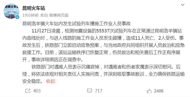 11月27日凌晨,检测地震设备的55537次试验列车在正常通过昆明洛羊镇站内曲线处时,与进入线路的施工作业人员发生碰撞,造成11人死亡、2人受伤。事故发生后,铁路部门立即启动应急预案,与当地政府共同组织开展人员救治和应急救援工作。目前,该站运输秩序已恢复正常,伤员救治和相关善后工作正有序展开,事故详细原因正在调查中。