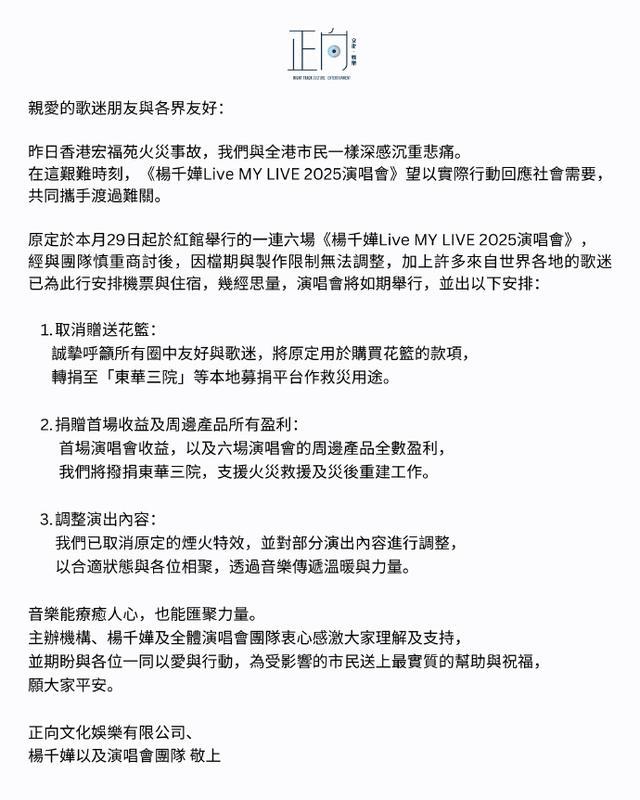 11月27日,正向文化娱乐发布公告,内容包括:杨千嬅呼吁将花篮钱转作救灾、捐赠首场收益及周边产品所有盈利、取消原定的烟火特效,并对部分演出内容进行调整。