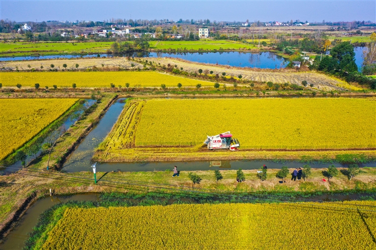信阳市光山县罗陈乡张楼村,田间抢收晚稻。 谢万柏 摄