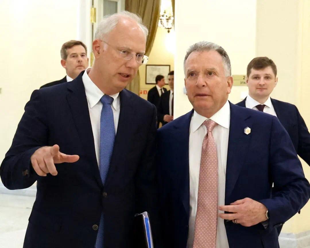 ▎俄罗斯特使德米特里耶夫(左)与美国特使威特科夫(右)合影,两人作为两国代表谈判制定了“28点和平计划”(图源:路透社)