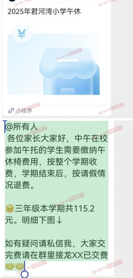 涉事学校是瀍河区君河湾小学,是一所公办小学。对此,11月24日,瀍河区教体局回复:该校联合爱心企业推出成本价午休设施,经家委会商议达成共识后,为午托学生配置午休椅,收费按天计算,期末结算。