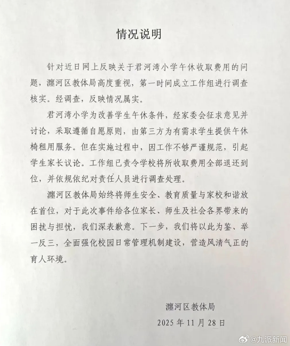 君河湾小学为改善学生午休条件,经家委会征求意见并讨论,采取遵循自愿原则,由第三方为有需求学生提供午休椅租用服务。但在实施过程中,因工作不够严谨规范,引起学生家长议论。工作组已责令学校将所收取费用全部退还到位,并依规依纪对责任人员进行调查处理。