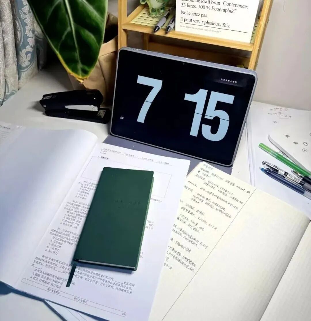 林桦从储物间里搬出闲置已久的桌子,摆放在客厅靠窗的位置。她是全职备考,每次开始复习前,她会打开时钟界面,黑底白字的数字醒目地告诉她时间的流逝。为了备考,她还卸载了手机里的视频软件,即使放松时也不看手机。她习惯用思维导图拆解任务和知识点,对自己的学习情况进行全局性的把控。