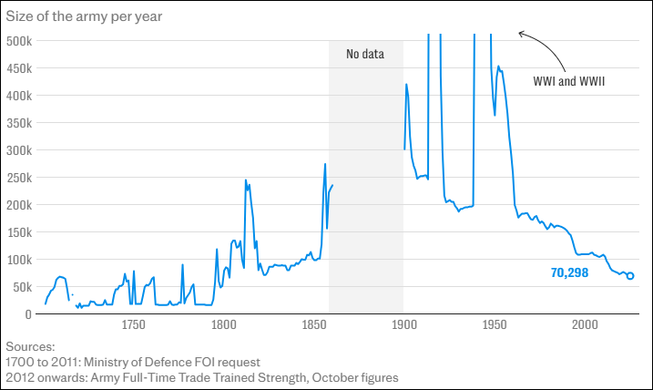 1700年至2025年英国军队规模趋势变化图 《每日电讯报》制图
