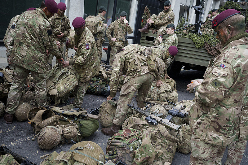 当地时间2025年11月8日,英国伦敦,伦敦金融城举行首届“女市长巡游”,伞兵团预备役部队第4伞兵营的成员在巡游前准备装备和工具。 视觉中国