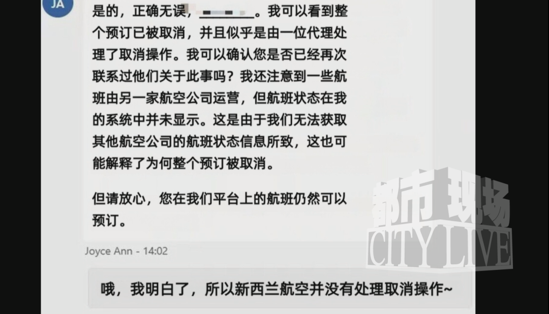 刘女士随后咨询了该航班执飞航司——新西兰航空,对方表示取消并非由航司发起,而是“第三方代理主动取消”。对此,去哪儿网客服回应称“航司没有让我们退票,但因为运价问题,票确实无法使用。”