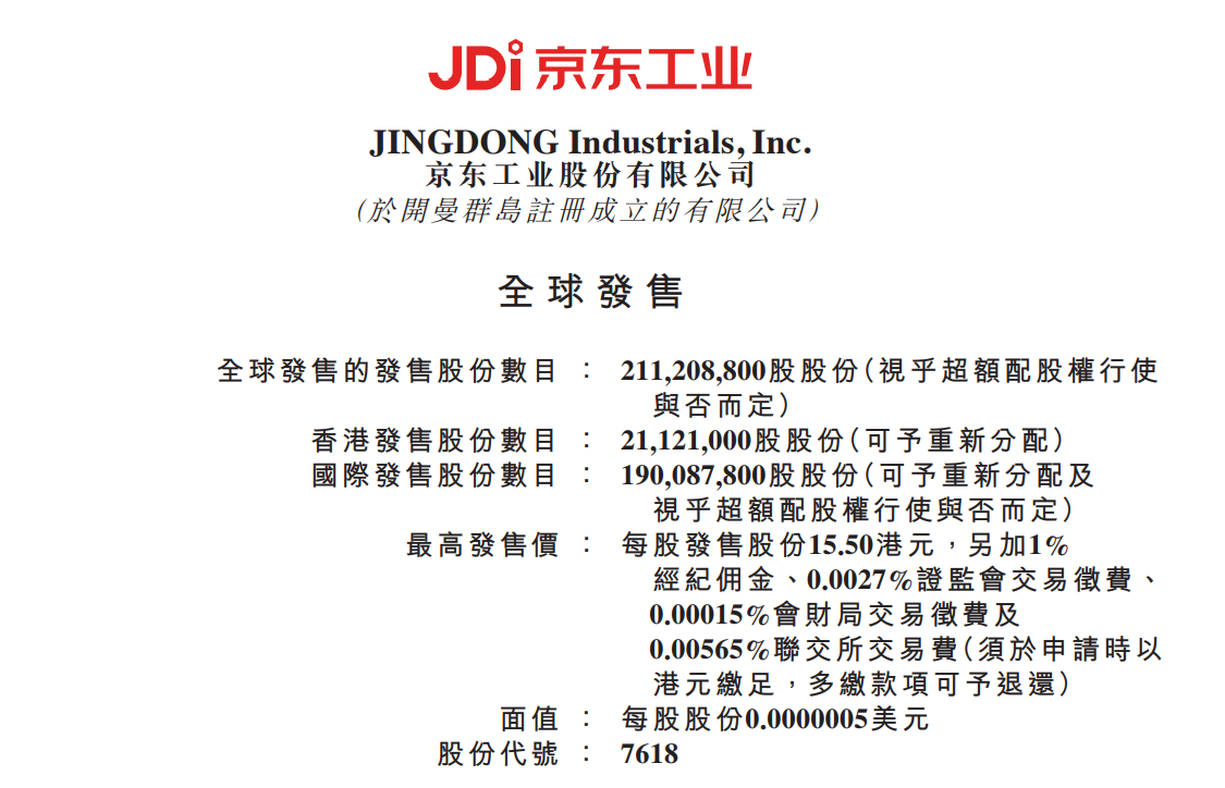 【大河财立方消息】12月3日早间,京东工业在港交所公告,公司拟全球发售约2.11亿股股份,香港发售股份2112.1万股,国际发售股份1.9亿股,另有15%的超额配股权;发售价不超每股15.50港元;预期股份将于2025年12月11日开始在香港联交所买卖。