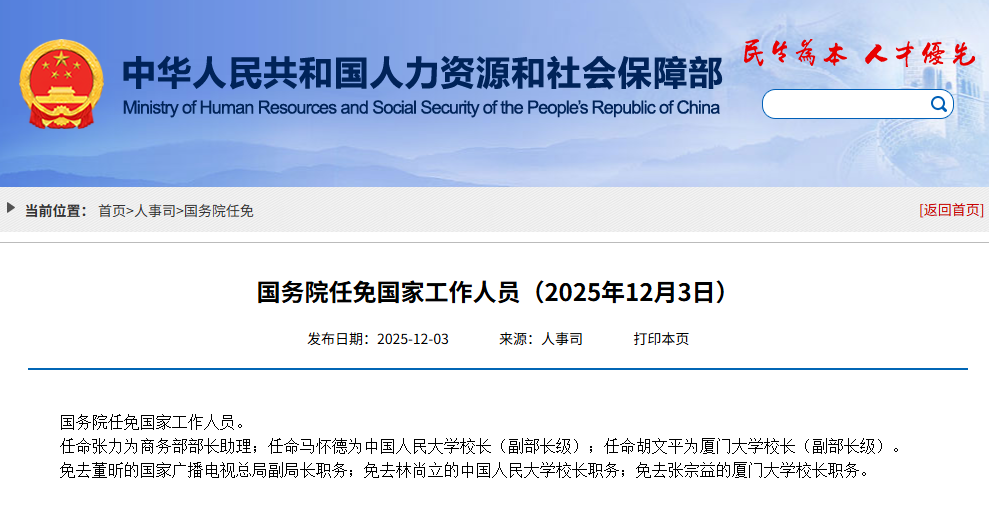任命张力为商务部部长助理;任命马怀德为中国人民大学校长(副部长级);任命胡文平为厦门大学校长(副部长级)。
