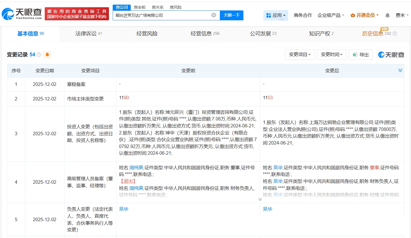 【大河财立方消息】 天眼查工商信息显示,近日,烟台芝罘万达广场有限公司发生工商变更,新华保险旗下坤华(天津)股权投资合伙企业(有限合伙)、坤元辰兴(厦门)投资管理咨询有限公司退出股东行列,新增万达商管旗下上海万达锐驰企业管理有限公司为全资股东,同时多位高管发生变更。