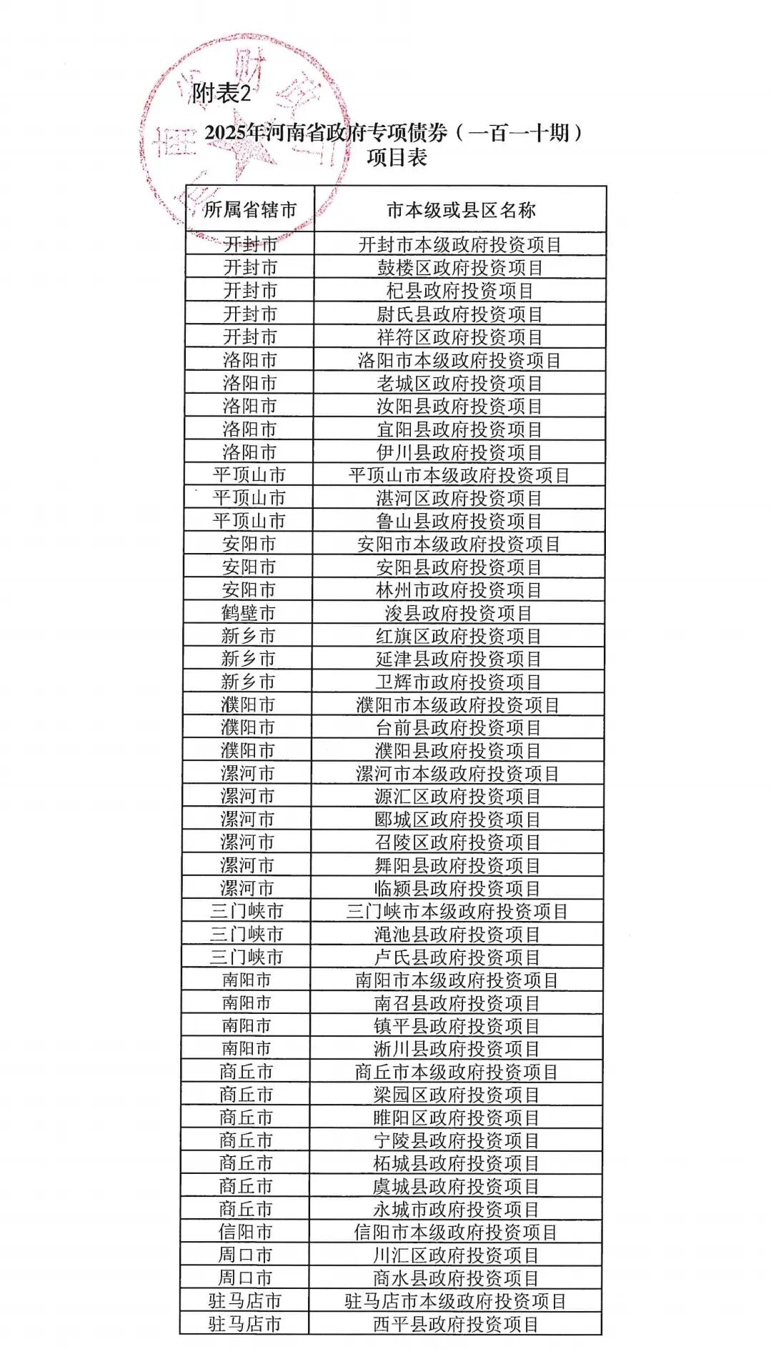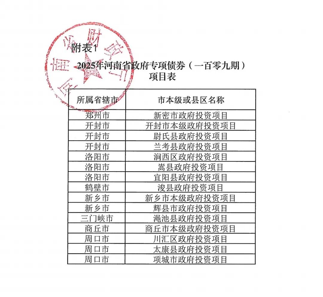 2025年河南省政府专项债券(一百零九期),将用于以下项目: