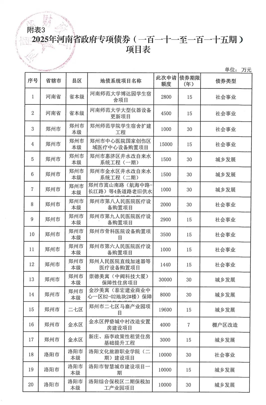 2025年河南省政府专项债券(一百一十一至一百一十五期),主要用于城乡发展、社会事业、棚户区改造等领域,具体如下: