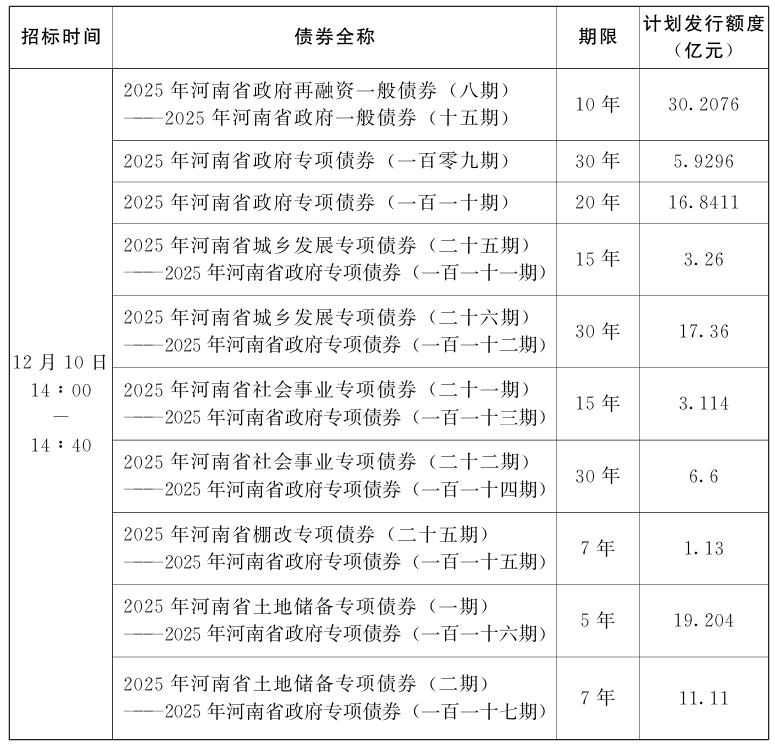 【大河财立方消息】 12月3日,为支持我省经济和社会发展,根据财政部有关规定,经河南省人民政府同意,河南省财政厅决定发行2025年河南省政府一般债券(十五期)、专项债券(一百零九至一百一十七期)。