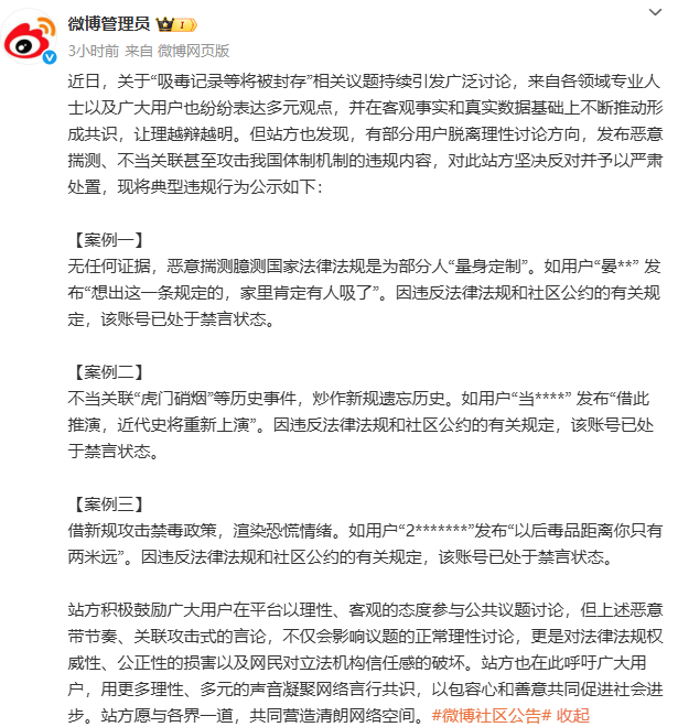 12月4日,微博社区管理官方微博“微博管理员”发文称,近日,关于“吸毒记录等将被封存”相关议题持续引发广泛讨论,来自各领域专业人士以及广大用户也纷纷表达多元观点,并在客观事实和真实数据基础上不断推动形成共识,让理越辩越明。但站方也发现,有部分用户脱离理性讨论方向,发布恶意揣测、不当关联甚至攻击我国体制机制的违规内容,对此站方坚决反对并予以严肃处置,现将典型违规行为公示如下: