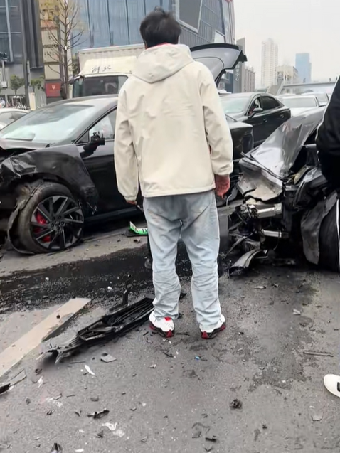 视频显示,涉事的灰色特斯拉车头受损严重,被撞的一辆黑色汽车也有不同程度的损伤,事发现场还有一名女子抱着小孩,地上散落着被撞坏的护栏,以及一些不明黑色液体流出。