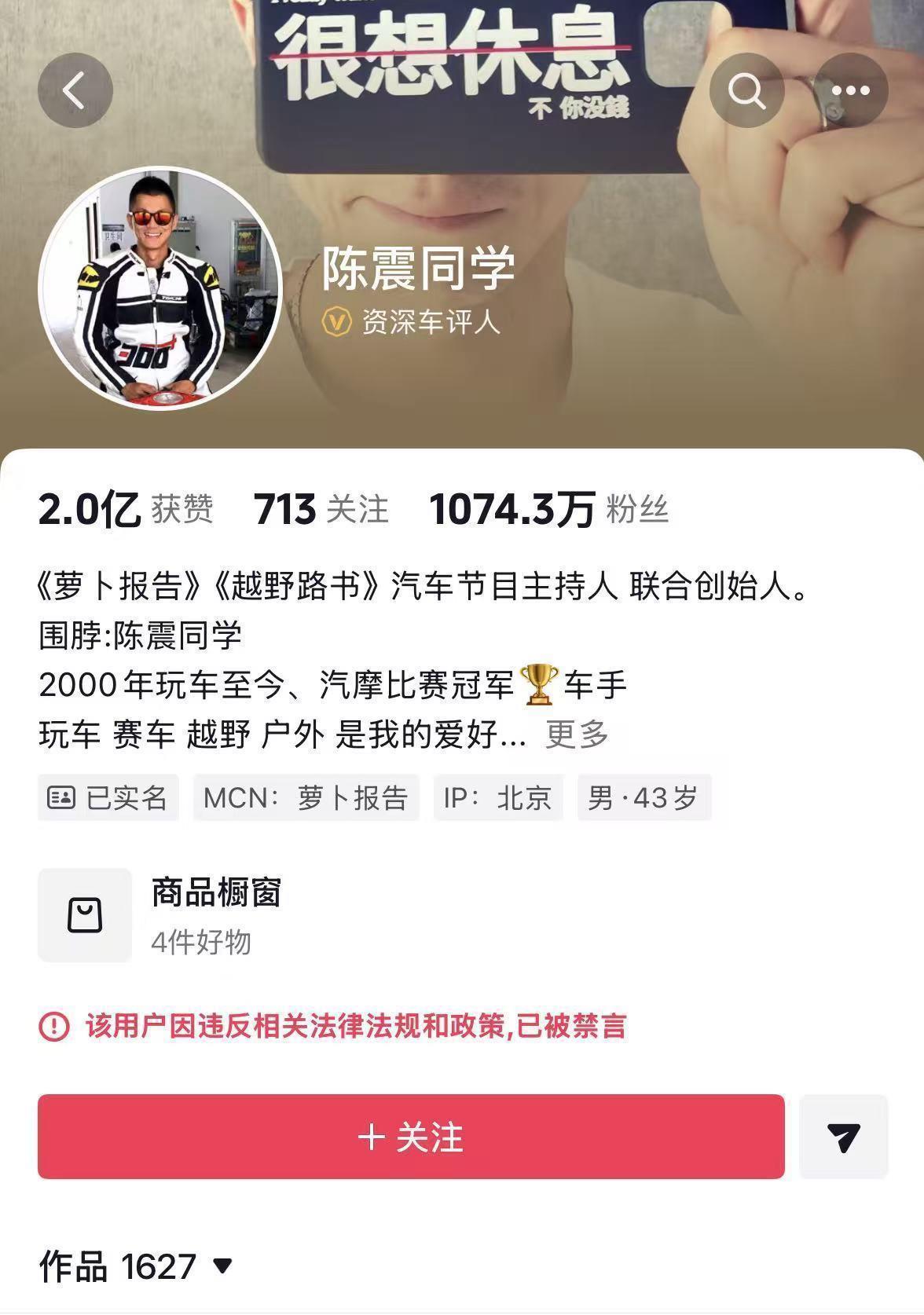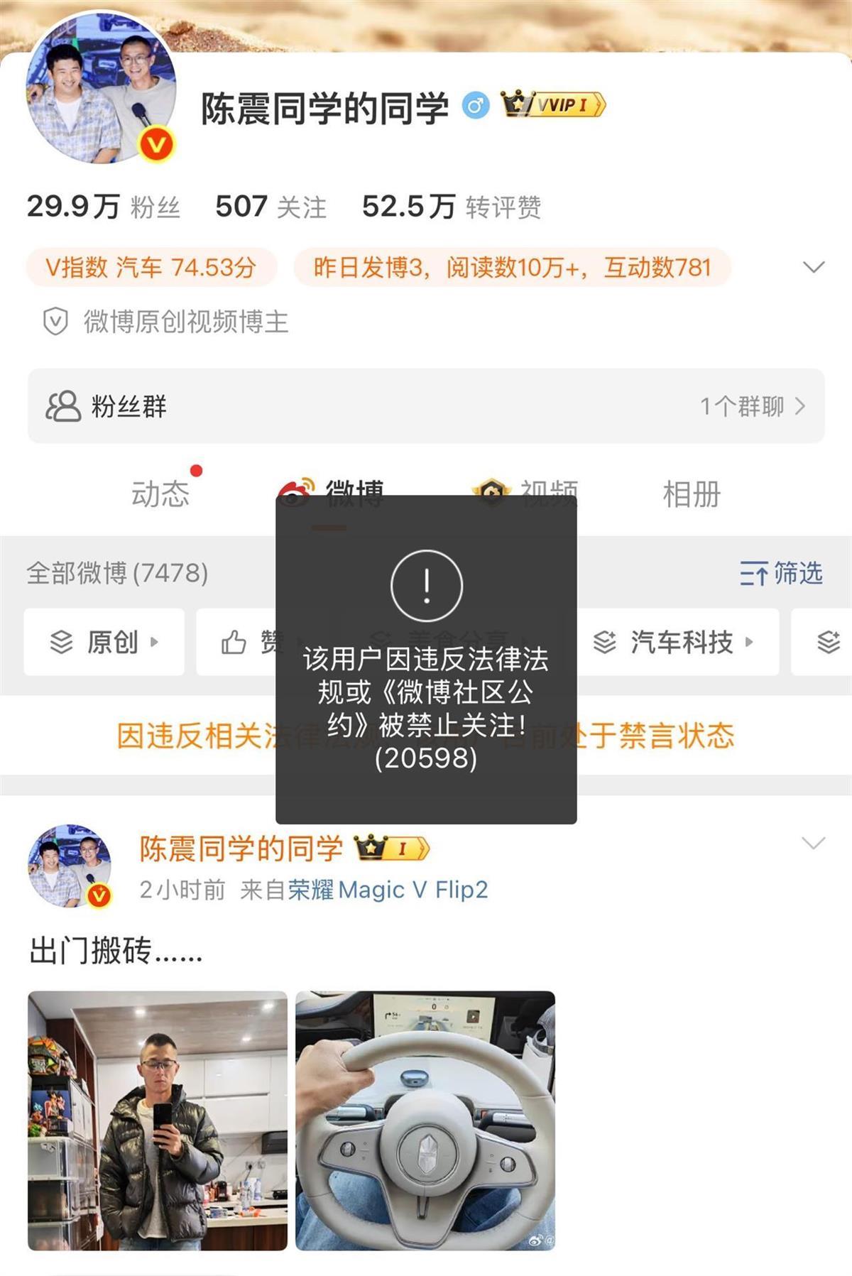 12月5日凌晨,全网粉丝量超2400万的知名车评人陈震,在抖音、快手、B站、微博等多个社交媒体上的账号先后被禁言或封禁,引发广泛关注。当日上午,其微博小号发布视频回应称“自作自受检讨自己”,但该账号随后亦被封禁。