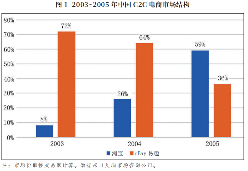 一个著名的例子是淘宝战胜eBay易趣。eBay易趣的前身易趣网于1999年在上海成立。2002年,eBay收购了易趣33%的股份,从此开始易趣更名为eBay易趣,并成为eBay在中国的子公司。得益于eBay的支持,eBay易趣迅速发展成为国内最大的在线C2C交易平台之一。巅峰时期,eBay易趣的用户量曾达到1000万。相比于eBay易趣,淘宝平台建立的时间要略晚。2003年5月,阿里巴巴的淘宝平台才正式上线。在淘宝上线之初,由于其在商业模式上与eBay非常类似,且在资金、技术等方面都较eBay易趣落后,因而其在市场竞争当中处于相对下风。如图1所示,在2003年,eBay易趣在中国C2C市场上的份额为72%,而淘宝只有8%,可谓难以望其项背。但戏剧性的是,仅仅两年之后,淘宝在C2C市场上的份额就上升到了59%,而eBay易趣的份额则下降到了36%。
