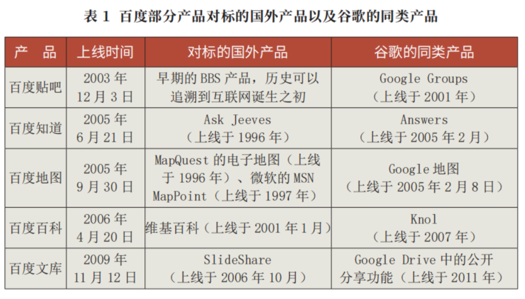 在表1中,我们对谷歌退出中国市场之前,百度推出的部分重要产品的相关信息进行了梳理。从表中可以看到,在这段时间内,百度把很多富有创意的国外产品的相关功能逐一集成到了自己的产品当中。在早期,这样的集成工作多少是通过模仿谷歌来间接实现的,但在后期,百度进行组合式创新的速度就超过了谷歌。比如,百度在2006年就上线了对标维基百科的百度百科,而谷歌一年后才上线了类似的产品Knol;百度在2009年就模仿SlideShare等产品上线了百度文库,而谷歌推出类似产品则是在2011年。