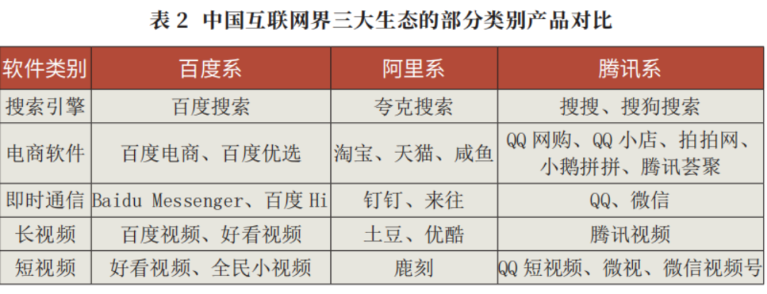 只要我们将“阿里系”“腾讯系”“百度系”曾推出的应用进行对比,就会发现它们存在着非常大的重合(见表2)。当某个中国互联网巨头发现市场上出现了一个具有创意的应用时,总是会尝试将其整合进自己的生态中来。即使发现自己的对手已经在某个市场上确立了优势,它们也会持续在这个市场上推出与之竞争的产品。