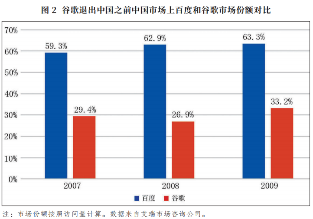 另一个例子是百度战胜谷歌。几年前,百度CEO李彦宏曾因一句“谷歌在中国市场上遭遇挫败的原因是其不了解中国互联网市场”而引来了大量网友的批评。在很多网友的直观印象中,谷歌退出中国市场的主要原因是它不愿意服从中国的监管政策,而百度作为一款完全模仿谷歌的产品只是在监管政策的保护之下才侥幸战胜了谷歌这个对手。不过,如果我们查找一下当时的数据,就会发现这种印象其实是错误的。实际上,在2010年谷歌退出中国市场之前,百度在中国市场上的份额已经持续大幅领先谷歌,并且这种领先幅度还在持续扩大(见图2)。