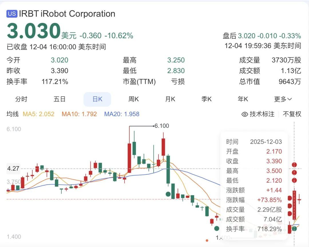 有趣的是,在iRobot披露文件后的12月4日,公司股价单日大涨近74%。消息面上,媒体报道,美国商务部长卢特尼克近期频繁会见机器人行业的CEO,在“全力支持”(all in)该行业加快发展,还称特朗普政府正考虑明年发布一项关于机器人的行政命令。