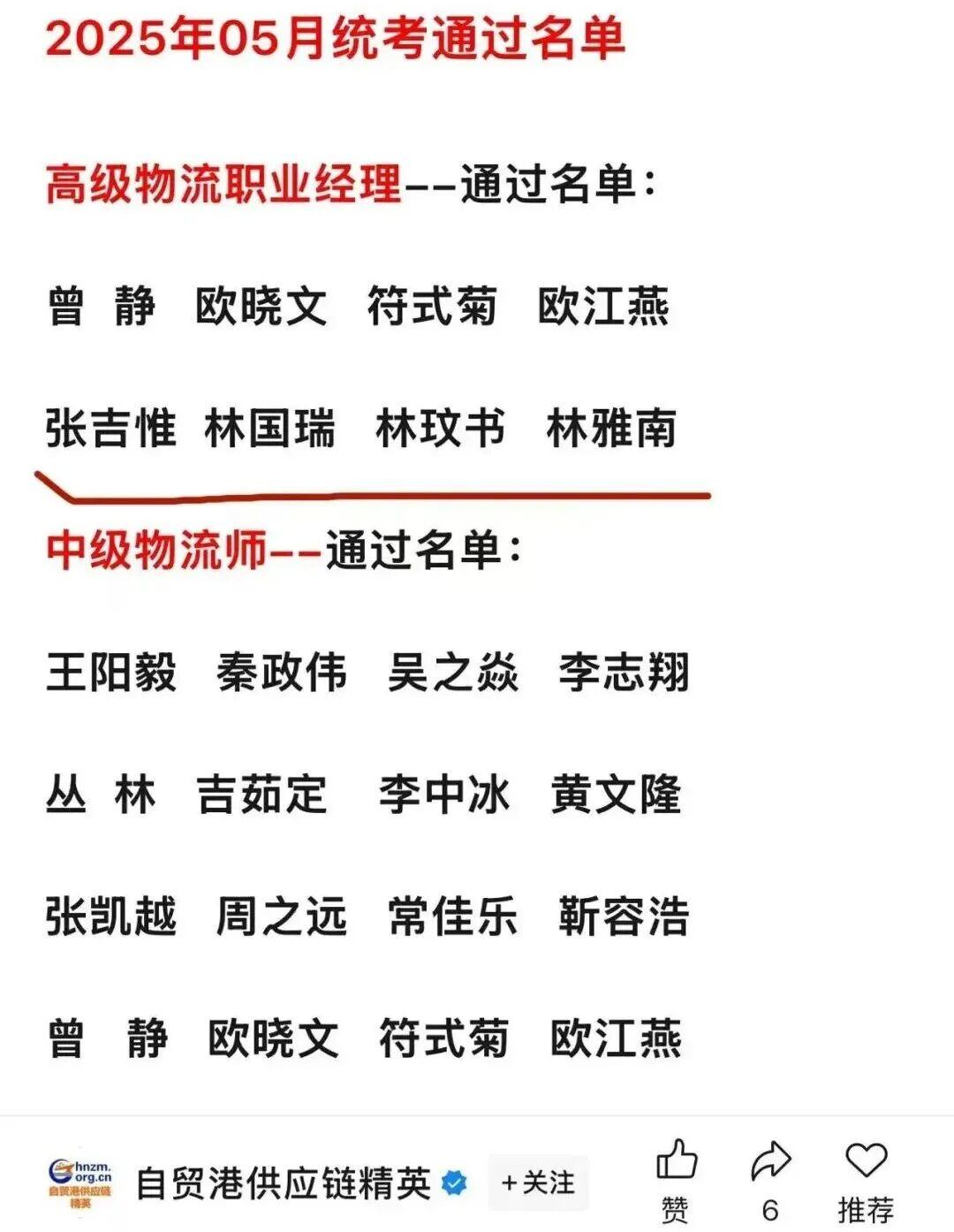今年5月,名为“自贸港供应链精英”的公众号发布的2025年5月高级物流职业经理统考通过名单里,张吉惟等4人再次出现。但记者发现,到12月5日该公众号已删除相关内容。