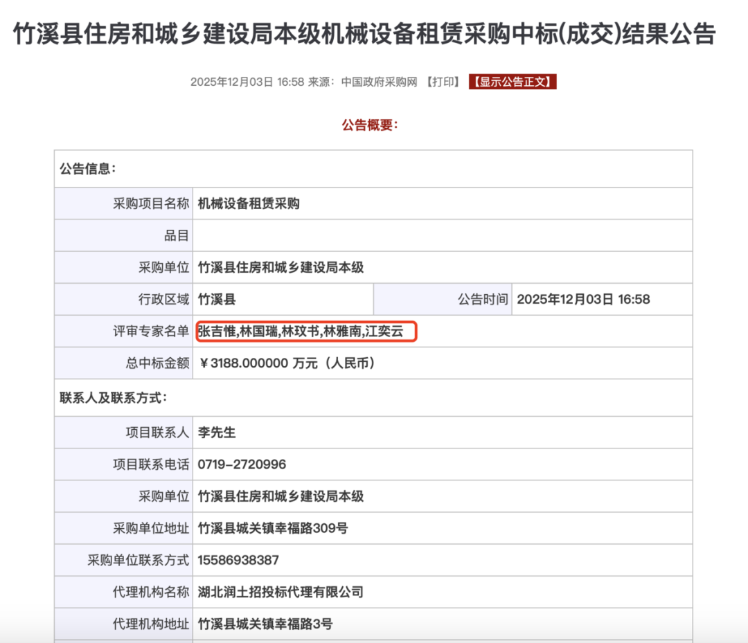 12月3日,《竹溪县住房和城乡建设局本级机械设备租赁采购中标(成交)结果公告》第五项评审小组成员,被曝来自网络文库的《人名大全》,媒体质疑该项目评审使用虚名凑人数。