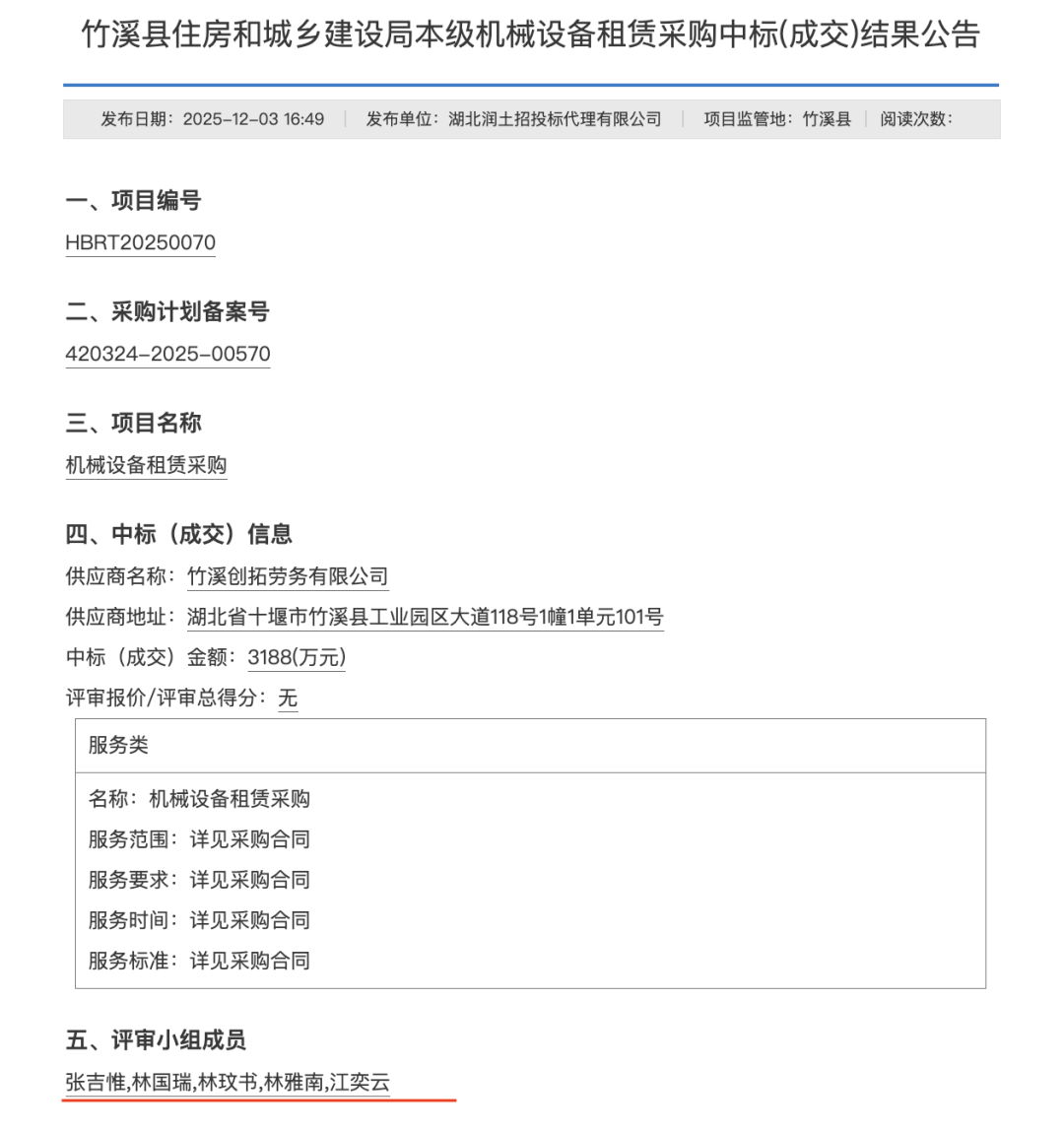 竹溪县住房和城乡建设局本级机械设备租赁采购中标(成交)结果公告中,评审小组五名成员与网络文档的前五个名字一致 图源:新京报