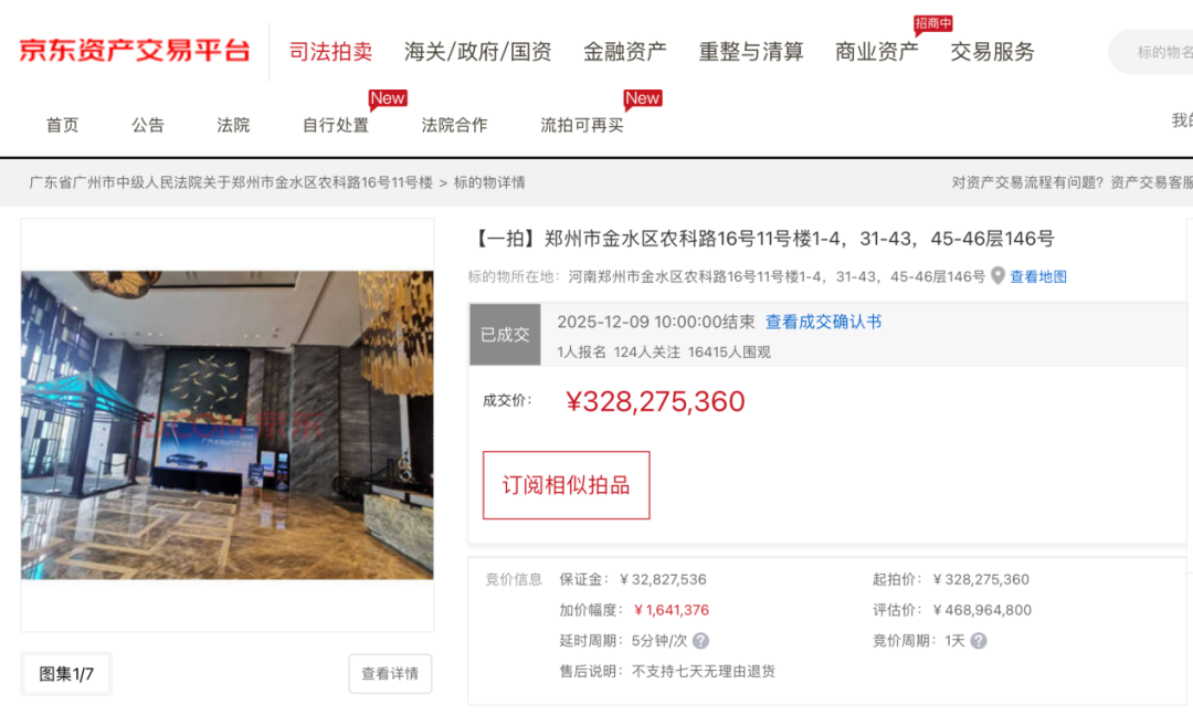 此次为该标的物首次拍卖,于12月9日上午10时结束,共吸引16415人围观,1人报名竞拍,124人关注。拍卖成交确认书显示,河南郑风郑韵酒店管理有限公司拍得该资产。
