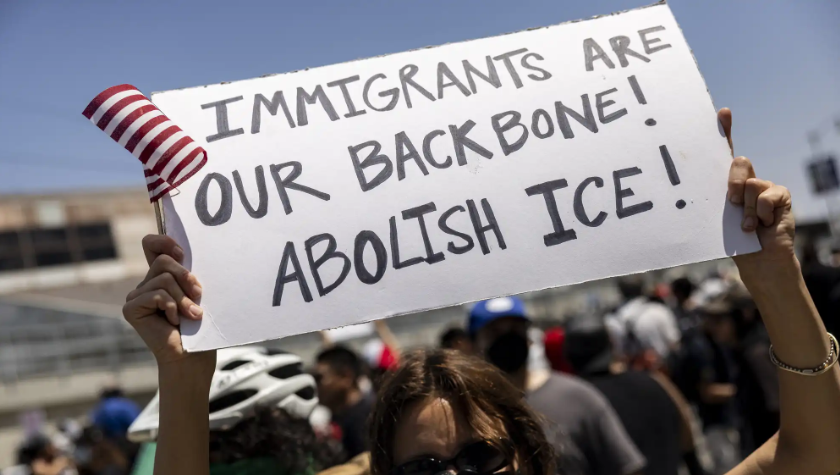 ▎6月8日,洛杉矶联邦采取打击移民行动后,一名示威者参加抗议活动。图源:AFP/ Getty Images