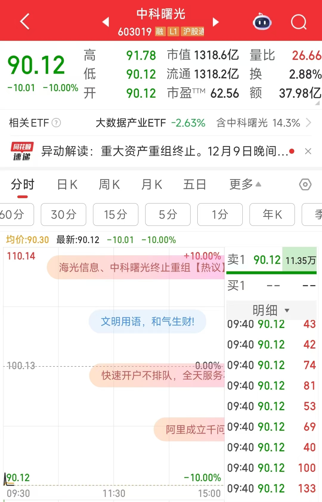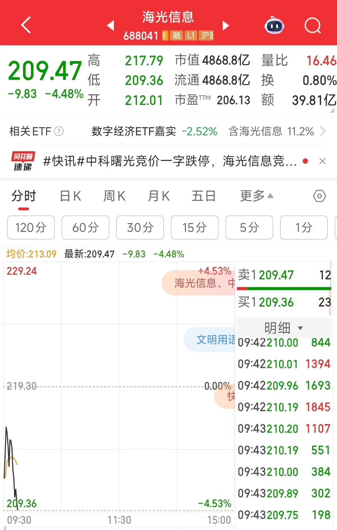 【大河财立方消息】12月10日,中科曙光集合竞价跌停后,开盘持续走低,截至9:40发稿,中科曙光再度跌停,报90.12元/股。海光信息同样低开,跌4.48%报209.47元/股。