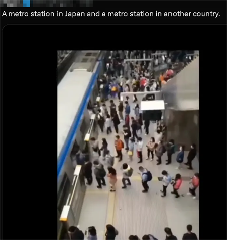 事实上,这种“地点误标”并非首次出现。今年年初,一段拍摄地铁站乘客上下车井然有序的视频在TikTok上走红,许多外国用户纷纷留言称赞“日本人的”秩序感,却未意识到画面拍摄地并非日本。